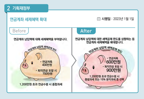 하지만 2023년 개정안을 살펴보면 소득 부분은 2개의 등급으로 간소화하였으며 세액공제 납입한도 또한 나이에 대한 차등을 없애고 연금 저축 (600만원) + 퇴직 연금(300만원) 으로 가입시 최대 900만원의 세액 공제를 받을 수 있게 되었습니다.