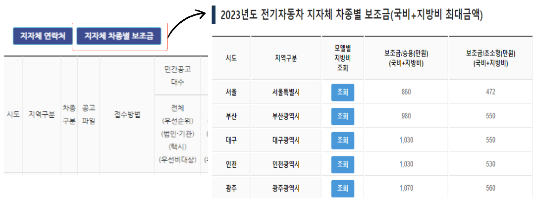 위에 링크로 이동하시고 자자체 차종별 보조금을 클릭하시면 전국 각 지역별 국고+지자체 보조금을 확인하실 수 있습니다.