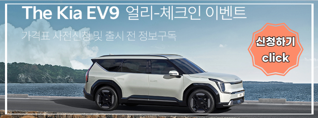 국내 최초 순수 전기 준대형 SUV로 출시되는 EV9에 대해 알아보았는데요. 패밀리카로 강력한 토크의 전기차와 평소 캠핑을 즐기거나 차박을 하시는 차량 오너분들에게는 최적의 환경을 제공할 것으로 보입니다. 출시 예정일은 2분기 5월 초에 사전 예약이 진행될 것으로 예상되네요. 미리 가격표와 출시 전 정보를 받아 보고 싶은 분들은 꼭 얼리 체크인 잊지 마세요!