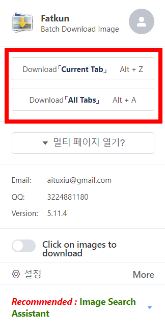프로그램 사용방법은 아주 간단하며 직관적입니다. 고정된 프로그램을 클릭하면 상단 이미지와 같은 창이 아래로 펼쳐지며 빨간 표시 박스의 내용처럼 "Current Tab"과 "All Tabs"이 있는데 "Current Tab"은 현재 보고 있는 페이지에 있는 이미지를 다운로드 할 수 있습니다. "All Tabs"은 브라우저에 여러 탭이 띄어져 있다면 모든 탭내에 있는 이미지도 한번에 다운로드할 수 있습니다.