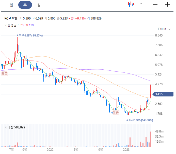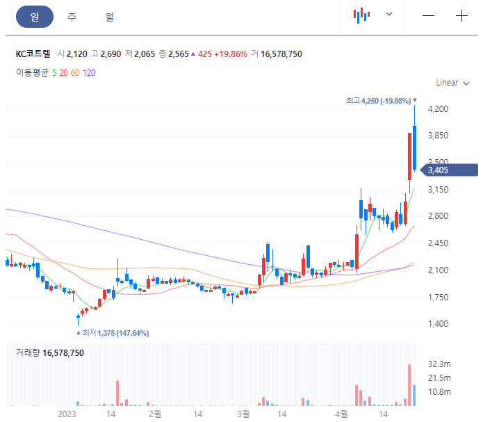 KC코트렐의 일봉차트를 보면 연초 저점 1375원을 기점으로 지속적인 상승흐름을 이어오고 있습니다. 최근에 희토류에 대한 중국의 수출 금지 조치가 시행될 예정으로 알려지며 희토류 관련주로 큰 상승 움직임을 보이고 있는데요. 최근에 변동성이 확대되면서 큰 상승,하락 움직임보이고 있습니다.