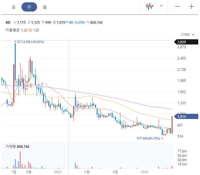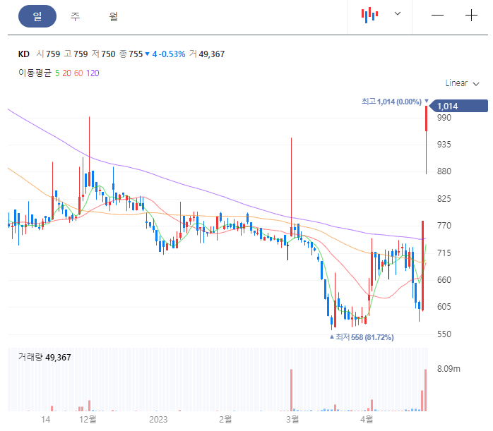 KD는 운영자금 조달 목적으로 10억원 규모의 일반 공모 유상증자를 실시한다고 공시했습니다. 발행되는 신주는 187만 2659주로 신주 발행가액은 주당 534원입니다. 현재 2023년 4월 26일 기준 1,014원이니 만약 청약을 받는다면 2배 가까운 시세차익을 얻을 수 있습니다. 신주 상장 예정일은 5월 11일입니다.